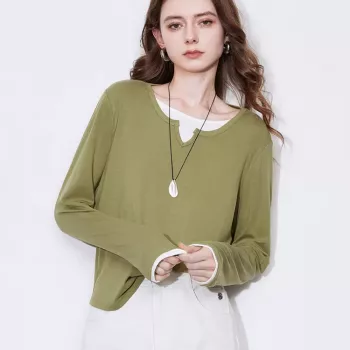 Women’s Color Blocking Splicing Fake Two Piece Slim Fit Long Sleeve T-shirt